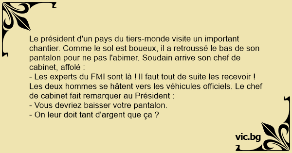 Le président d'un pays du tiers-monde visite un important chantier. Comme le sol est boueux, il a retroussé le bas de son pantalon pour ne pas l'abimer. Soudain arrive son chef de cabinet, affolé :