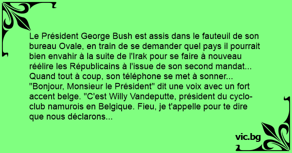"Bonjour, Monsieur le Président" dit une voix avec un fort accent belge. "C'est Willy Vandeputte, président du cyclo-club namurois en Belgique. Fieu, je t'appelle pour te dire que nous déclarons officiellement la guerre aux États-Unis!"
