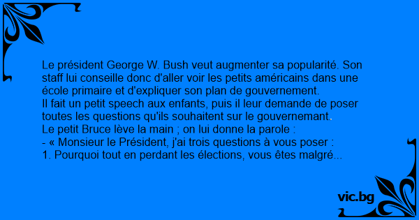 Le président George W. Bush veut augmenter sa popularité. Son staff lui conseille donc d'aller voir les petits américains dans une école primaire et d'expliquer son plan de gouvernement.
