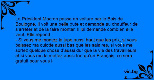 Le Président Macron passe en voiture par le Bois de Boulogne. Il voit une belle рuте et demande au chauffeur de s’arrêter et de la faire monter. Il lui demande combien elle veut. Elle répond :