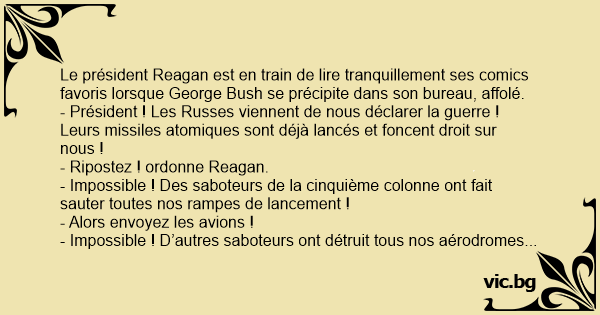 Le président Reagan est en train de lire tranquillement ses comics favoris lorsque George Bush se précipite dans son bureau, affolé.