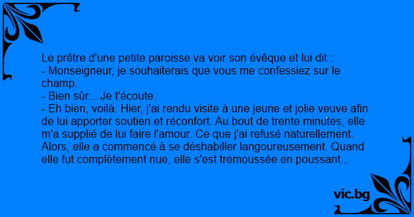- Eh bien, voilà. Hier, j'ai rendu visite à une jeune et jolie veuve afin de lui apporter soutien et réconfort. Au bout de trente minutes, elle m'a supplié de lui faire l'amour. Ce que j'ai refusé naturellement. Alors, elle a commencé à se déshabiller langoureusement. Quand elle fut complètement nue, elle s'est trémoussée en poussant de petites plaintes. Du coup, je me suis enfui précipitemment et j'ai demandé pardon à Dieu.