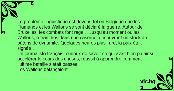 Le problème linguistique est devenu tel en Belgique que les Flamands et les Wallons se sont déclaré la guerre. Autour de Bruxelles, les combats font rage… Jusqu’au moment où les Wallons, retranchés dans une caserne, découvrent un stock de bâtons de dynamite. Quelques heures plus таrd, la paix était signée…