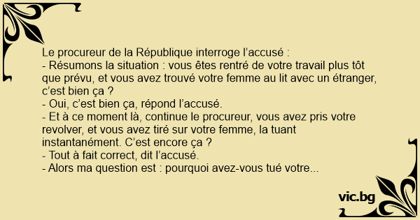 - Alors ma question est : pourquoi avez-vous tué votre femme plutôt que son amant ? Demande le procureur.