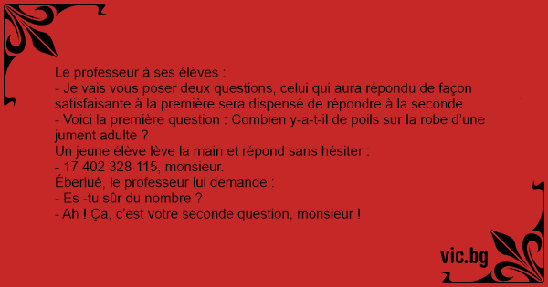 - Je vais vous poser deux questions, celui qui aura répondu de façon satisfaisante à la première sera dispensé de répondre à la seconde.