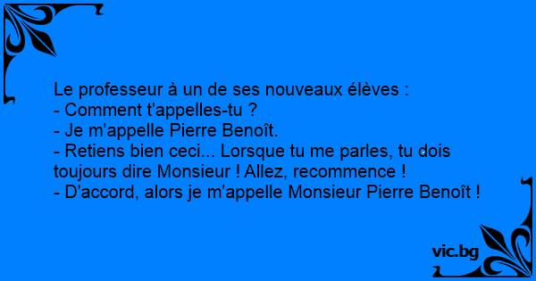 - D'accord, alors je m'appelle Monsieur Pierre Benoît !