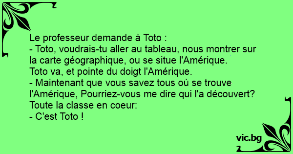 La maîtresse : Toto, tu peut me dire où se trouve l'Amérique ? Toto : ici La maîtresse : Bravo Toto !!!!! La maîtresse: Qui pourrais me dire qui a découvert l'Amérique ? Tout le monde: BAH Toto Madame