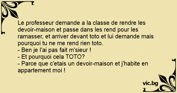 Le professeur demande a la classe de rendre les devoir-maison et passe dans les rend pour les ramasser, et arriver devant toto et lui demande mais pourquoi tu ne me rend rien toto.
