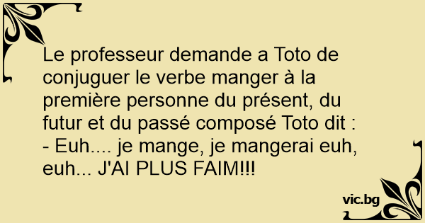 Le professeur demande a Toto de conjuguer le verbe manger à la première personne du présent, du futur et du passé composé Toto dit :