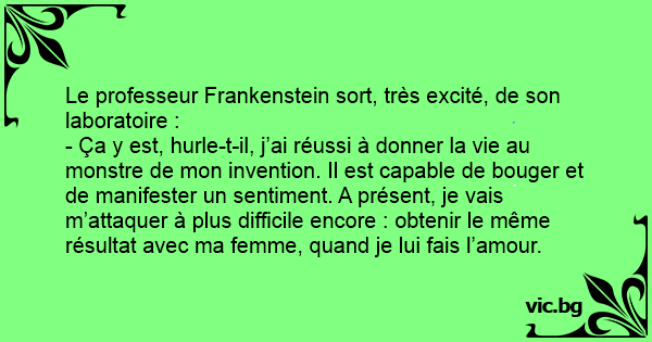 - Ça y est, hurle-t-il, j’ai réussi à donner la vie au monstre de mon invention. Il est capable de bouger et de manifester un sentiment. A présent, je vais m’attaquer à plus difficile encore : obtenir le même résultat avec ma femme, quand je lui fais l’amour.