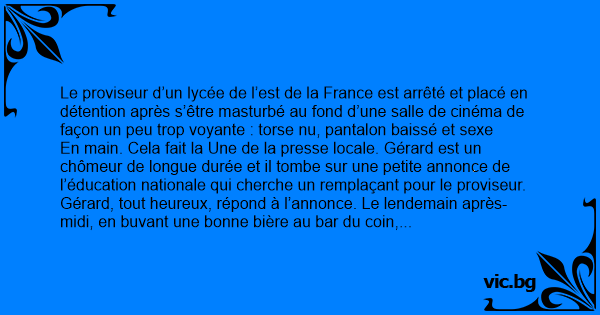 En main. Cela fait la Une de la presse locale. Gérard est un chômeur de longue durée et il tombe sur une petite annonce de l’éducation nationale qui cherche un remplaçant pour le proviseur. Gérard, tout heureux, répond à l’annonce. Le lendemain après-midi, en buvant une воnnе bière au bar du coin, Gérard raconte à ses copains qu’il vient de postuler à l’annonce. Robert lui demande :