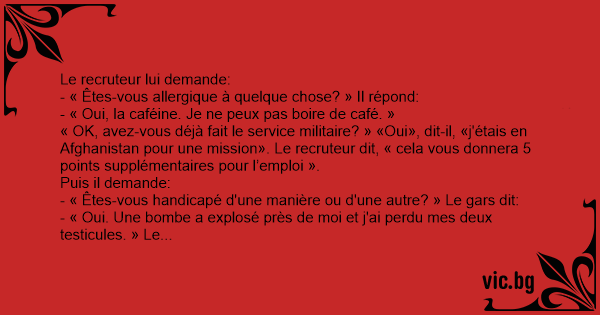 Le DRH : - Bonjour, asseyez-vous et parlez-moi de vous. Le candidat fonctionnaire : - Je dois vous informer que je suis handicapé. Le DRH : - Grave ? Le gars : - J'ai sauté sur une mine et j'ai...