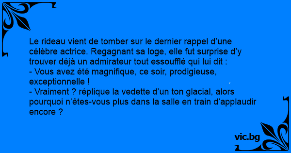 Le rideau vient de tomber sur le dernier rappel d’une célèbre actrice. Regagnant sa loge, elle fut surprise d’y trouver déjà un admirateur tout essoufflé qui lui dit :