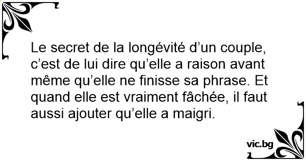 Le secret de la longévité d’un couple, c’est de lui dire qu’elle a raison avant même qu’elle ne finisse sa phrase. Et quand elle est vraiment fâchée, il faut aussi ajouter qu’elle a maigri.