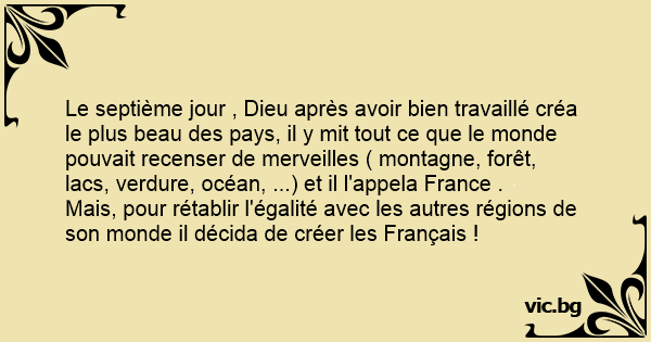 Le septième jour , Dieu après avoir bien travaillé créa le plus beau des pays, il y mit tout ce que le monde pouvait recenser de merveilles ( montagne, forêt, lacs, verdure, océan, ...) et il l'appela France .
