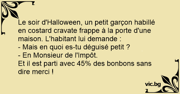 Le soir d'Halloween, un petit garçon habillé en costard cravate frappe à la porte d'une maison. L'habitant lui demande :
