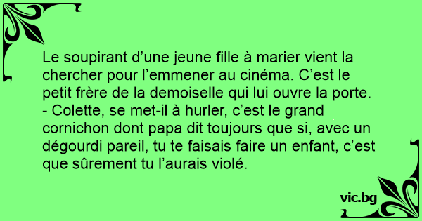 - Colette, se met-il à hurler, c’est le grand cornichon dont papa dit toujours que si, avec un dégourdi pareil, tu te faisais faire un enfant, c’est que sûrement tu l’aurais violé.