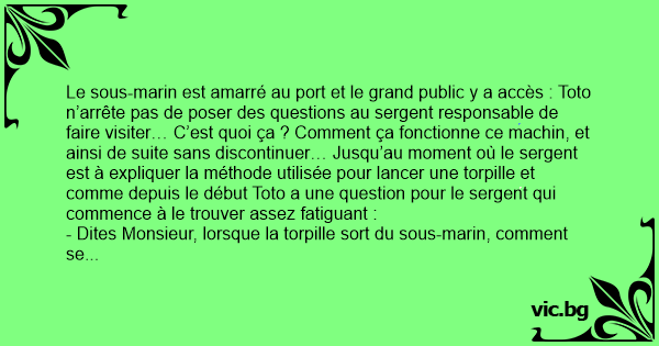 Le sous-marin est amarré au port et le grand public y a accès : Toto n’arrête pas de poser des questions au sergent responsable de faire visiter… C’est quoi ça ? Comment ça fonctionne ce machin, et ainsi de suite sans discontinuer… Jusqu’au moment où le sergent est à expliquer la méthode utilisée pour lancer une torpille et comme depuis le début Toto a une question pour le sergent qui commence à le trouver assez fatiguant :