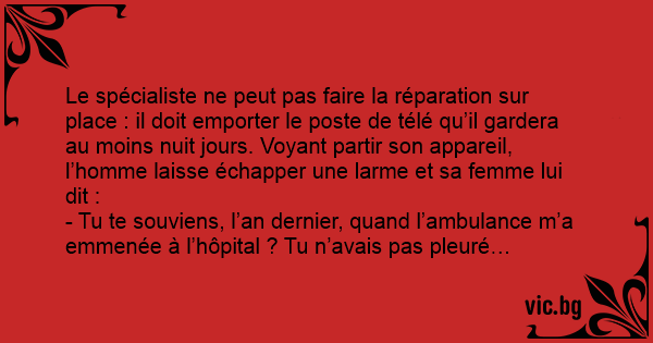 Le spécialiste ne peut pas faire la réparation sur place : il doit emporter le poste de télé qu’il gardera au moins nuit jours. Voyant partir son appareil, l’homme laisse échapper une larme et sa femme lui dit :