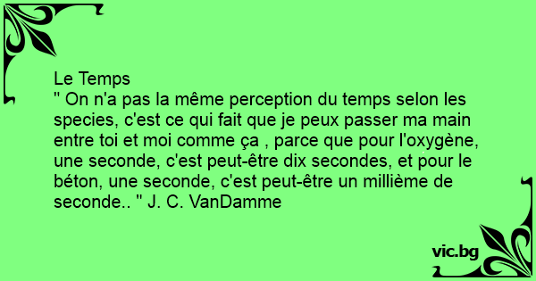Le Temps " On n'a pas la même perception du temps selon les species, c'est ce qui fait que je peux passer ma main entre toi et moi comme ça , parce que pour l'oxygène, une seconde, c'est peut-être dix secondes, et pour le béton, une seconde, c'est peut-être un millième de seconde.. " J. C. VanDamme