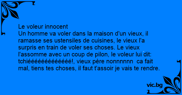 Un homme va voler dans la maison d'un vieux, il ramasse ses ustensiles de cuisines, le vieux l'a surpris en train de voler ses choses. Le vieux l'assomme avec un coup de pilon, le voleur lui dit: tchiééééééééééééé!, vieux père nonnnnnn ca fait mal, tiens tes choses, il faut t'assoir je vais te rendre.