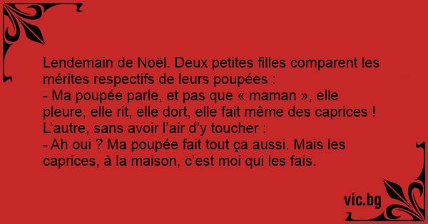 Lendemain de Noël. Deux petites filles comparent les mérites respectifs de leurs poupées :