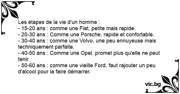 - 50-60 ans : comme une vieille Ford, faut rajouter un peu d'alcool pour la faire démarrer.