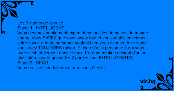 C'est le stade final de l'ivresse. A ce moment vous pouvez faire tout ce qui vous passe par la tête car PERSONNE NE PEUT VOUS VOIR ! Vous pouvez danser sur une table pour… >> Cliquez pour lire la suite