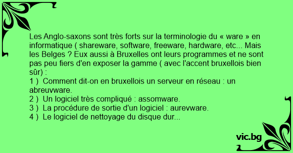 Les Anglo-saxons sont très forts sur la terminologie du « ware » en informatique ( shareware, software, freeware, hardware, etc... Mais les Belges ? Eux aussi à Bruxelles ont leurs programmes et ne sont pas peu fiers d'en exposer la gamme ( avec l'accent bruxellois bien sûr) :