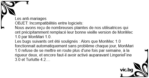 Les anti-mariages OBJET: Incompatibilités entre logiciels: Nous avons reçu de nombreuses plaintes de nos utilisatrices qui ont précipitamment remplacé leur воnnе vieille version de MonMec 1.0 par MonMari 1.0. Les bugs suivants ont été soulignés : Alors que MonMec 1.0 fonctionnait automatiquement sans problème chaque jour, MonMari 1.0 refuse de se mettre en route plus d'une fois par semaine, à la rigueur deux, et encore faut-il avoir activé auparavant LingerieFine 3.0 et Turlutte 4.2. MonMec 1.0 était livré avec de nombreuses extensions différentes, alors que MonMari 1.0 n'en propose qu'une seule : l'extension #missionnaire#. Alors que MonMec 1.0 fonctionnait sans problème pendant 24 heures, MonMari 1.0 se désactive au bout de 3 minutes et affiche le message #exécution de la routine terminée, passage en mode veille#, la phase de veille étant accompagnée de l'émission d'un inquiétant bourdonnement de l'unité centrale, impossible à supprimer. Certaines utilisatrices ont pu désactiver la carte-son par application de la fonction #oreiller sur la tête#, mais cela peut provoquer des arrêts systèmes complets. Les extensions BouquetDeFleur, CaféAuLit, RepasAuxChandelles et VeniseTravel ont été tout bonnement supprimées sur MonMari 1.0 et remplacées par des extensions tout à fait superflues telles que TVfoot, TVrugby, TVformule1 et CuiteAvecMesPotes. De plus, ces extensions se mettent automatiquement en route toutes les fois qu'on essaye d'activer l'extension VaisselleWash, qui fonctionnait pourtant très bien sur MonMec 1.0. L'extension EcouteMesHistoires, plus ou moins développée selon les différentes versions de MonMec 1.0, a complètement disparu de MonMari 1.0. Les utilisatrices ayant essayé d'installer la version MonMec 2.0 pour suppléer aux déficiences de MonMari 1.0 ont essuyé de cuisants échecs, MonMari 1.0 étant équipé de l'anti-virus PoingDansLaGueule 8.0. En raison d'une utilis… >> Cliquez pour lire la suite