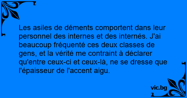 Les asiles de déments comportent dans leur personnel des internes et des internés. J'ai beaucoup fréquenté ces deux classes de gens, et la vérité me contraint à déclarer qu'entre ceux-ci et ceux-là, ne se dresse que l'épaisseur de l'accent aigu.