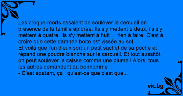 Les croque-morts essaient de soulever le cercueil en présence de la famille éplorée. Ils s'y mettent à deux, ils s'y mettent à quatre. Ils s'y mettent à huit ... rien à faire. C'est à croire que cette damnée boite est vissée au sol.