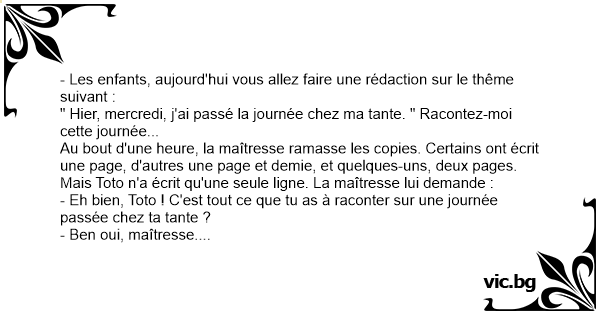 Au bout d'une heure, la maîtresse ramasse les copies. Certains ont écrit une page, d'autres une page et demie, et quelques-uns, deux pages. Mais Toto n'a écrit qu'une seule ligne. La maîtresse lui demande :