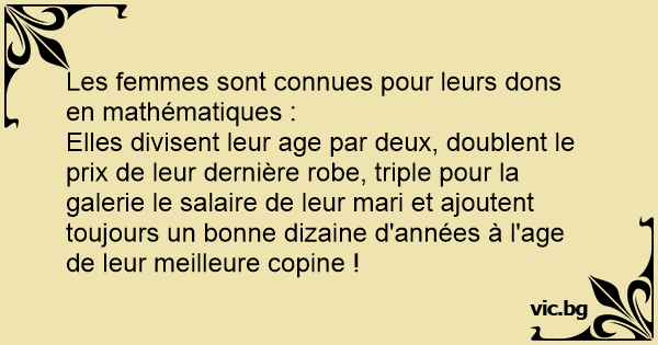 Elles divisent leur age par deux, doublent le prix de leur dernière robe, triple pour la galerie le salaire de leur mari et ajoutent toujours un воnnе dizaine d'années à l'age de leur meilleure copine !