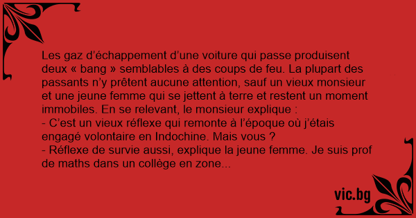 Les gaz d’échappement d’une voiture qui passe produisent deux « ваng » semblables à des coups de feu. La plupart des passants n’y prêtent aucune attention, sauf un vieux monsieur et une jeune femme qui se jettent à terre et restent un moment immobiles. En se relevant, le monsieur explique :