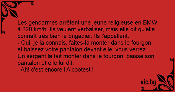 Les gendarmes arrêtent une jeune religieuse en BMW à 220 km/h. Ils veulent verbaliser, mais elle dit qu'elle connaît très bien le brigadier. Ils l'appellent: