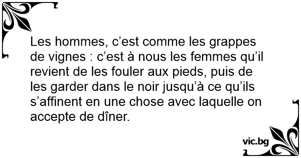 Les hommes, c’est comme les grappes de vignes : c’est à nous les femmes qu’il revient de les fouler aux pieds, puis de les garder dans le noir jusqu’à ce qu’ils s’affinent en une chose avec laquelle on accepte de dîner.