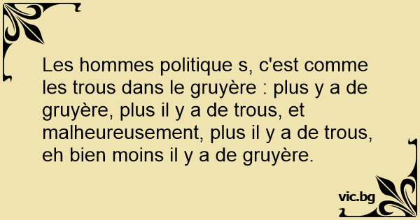Les hommes politique s, c'est comme les trous dans le gruyère : plus y a de gruyère, plus il y a de trous, et malheureusement, plus il y a de trous, eh bien moins il y a de gruyère.