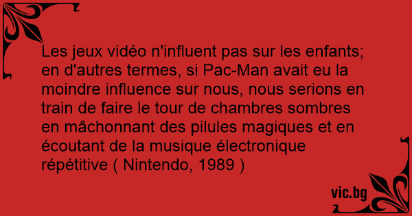 Les jeux vidéo n'influent pas sur les enfants; en d'autres termes, si Pac-Man avait eu la moindre influence sur nous, nous serions en train de faire le tour de chambres sombres en mâchonnant des pilules magiques et en écoutant de la musique électronique répétitive ( Nintendo, 1989 )