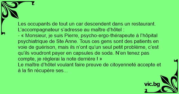 - « Monsieur, je suis Pierre, рsyсhо-ergo-thérapeute à l’hôpital psychiatrique de Ste Anne. Tous ces gens sont des patients en voie de guérison, mais ils n’ont qu’un seul petit problème, c’est qu’ils voudront payer en capsules de soda. N’en tenez pas compte, je réglerai la note derrière ! »
