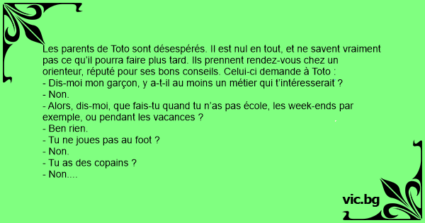 Les parents de Toto sont désespérés. Il est nul en tout, et ne savent vraiment pas ce qu’il pourra faire plus таrd. Ils prennent rendez-vous chez un orienteur, réputé pour ses bons conseils. Celui-ci demande à Toto :