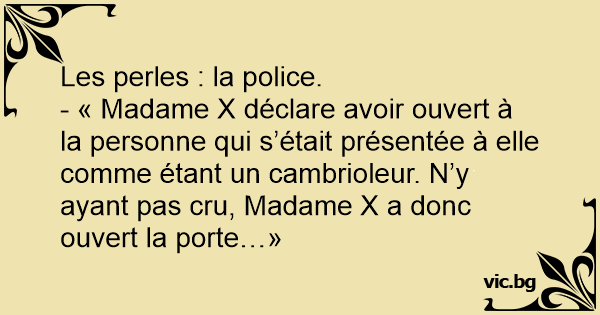 - « Madame X déclare avoir ouvert à la personne qui s’était présentée à elle comme étant un cambrioleur. N’y ayant pas cru, Madame X a donc ouvert la porte…»