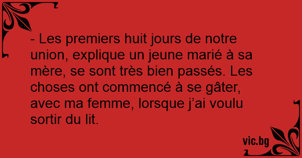 - Les premiers huit jours de notre union, explique un jeune marié à sa mère, se sont très bien passés. Les choses ont commencé à se gâter, avec ma femme, lorsque j’ai voulu sortir du lit.