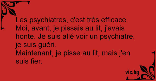 Les psychiatres, c'est très efficace. Moi, avant, je pissais au lit, j'avais honte. Je suis allé voir un psychiatre, je suis guéri.