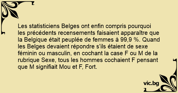 Les statisticiens Belges ont enfin compris pourquoi les précédents recensements faisaient apparaître que la Belgique était peuplée de femmes à 99,9 %. Quand les Belges devaient répondre s'ils étaient de sexe féminin ou masculin, en cochant la case F ou M de la rubrique Sexe, tous les hommes cochaient F pensant que M signifiait Mou et F, Fort.