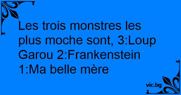 Les trois monstres les plus moche sont, 3:Loup Garou 2:Frankenstein 1:Ma belle mère