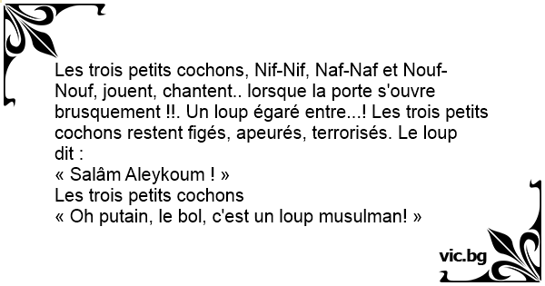C'est les trois petits cochons, ils sont dans leur maison, ils entendent frapper à la porte donc ils ouvrent. Derrière la porte c'est le grand méchant loup et il leur dit : Salam aleykoum Ouf il est musulman !