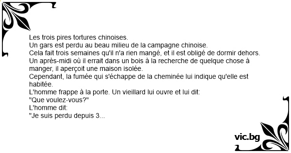 Un homme est perdu dans les montagnes en Chine depuis trois semaines, quand il aperçoit enfin une maison. Il frappe à la porte. - Oui ? - Bonsoir, je suis perdu depuis trois semaines, je n'ai pas...