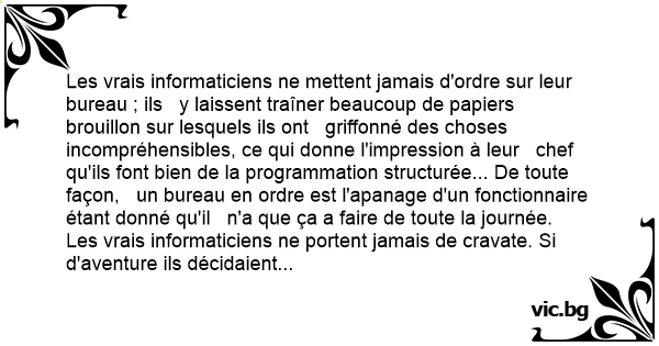Les vrais informaticiens ne mettent jamais d'ordre sur leur bureau ; ils y laissent traîner beaucoup de papiers brouillon sur lesquels ils ont griffonné des choses incompréhensibles, ce qui donne l'impression à leur chef qu'ils font bien de la programmation structurée... De toute façon, un bureau en ordre est l'apanage d'un fonctionnaire étant donné qu'il n'a que ça a faire de toute la journée.
