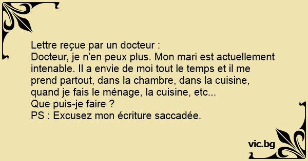 Docteur, je n'en peux plus. Mon mari est actuellement intenable. Il a envie de moi tout le temps et il me prend partout, dans la chambre, dans la cuisine, quand je fais le ménage, la cuisine, etc...